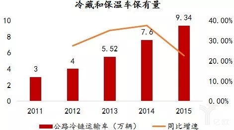 自2013年以来,我国冷冻冷藏车以近万台量级增长,并且于2014年突破万台大关,新增车辆达1.13万台,2011-2015年复合增长率达到7.21%。截至2015年,我国冷冻冷藏车总保有量达9.9万台,2011年至2015年,我国冷冻冷藏车保有量复合增长率达13.9%。随着生鲜电商对冷冻冷藏车需求的不断拓宽,我们预计冷冻冷藏车市场整体需求仍将保持12%以上的增速。