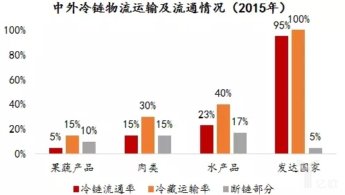 长期以来,我国初级农产品冷链运输率一直低于欧美发达国家。国外果蔬、肉类、水产品的80%~90%为冷链运输,而国内冷链运输率仅为15%、30%和40%;国内冷链过程断链比例高达67%、50%和42%,远远高于发达国家冷链断链比例。