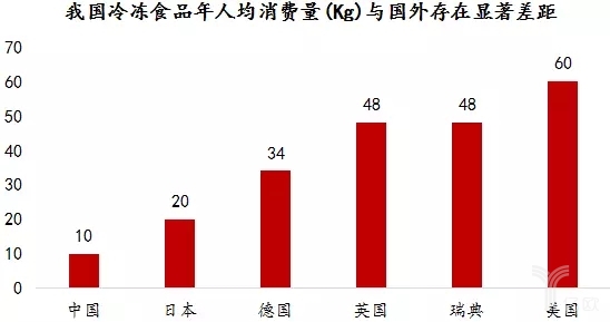 我国冷冻食品年人均消费量仅为10kg,低于日本的20kg,远远低于美国的60kg。这是由于中国居民对于冷冻食品依赖性较弱以及冷链食品供给端尚未产业化、规模化所致。