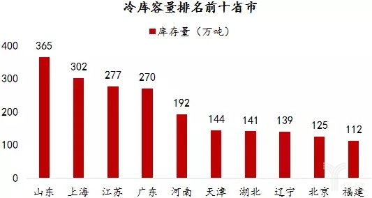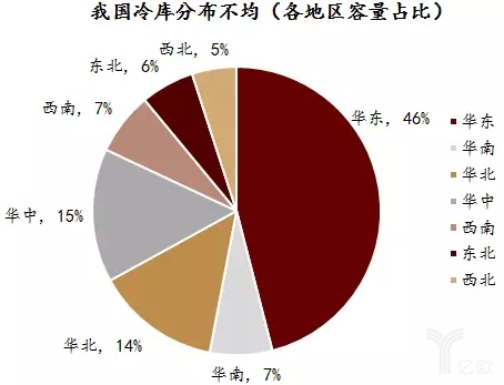 由于我国经济发展的地域性特点,我国冷库分布不均匀,华东地区冷库容量已占到全国冷库总容量近46%,其中山东、上海、江苏发展速度较快,冷库容量居前列;而我国果蔬产地的内陆各省市市场冷库容量仍旧偏低,造成冷链物流在生产源头缺乏预冷,产生源头“断链”。局部供需的不匹配和冷链运输能力不足导致企业仓储能力未充分发挥,与人口、经济发展并不匹配,这也决定了冷链物流未来成长的空间依然较大。