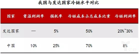 目前看来,预冷环节缺失、经营分散、运输网络落后、缺乏有效的信息管理是我国冷链成本较高的主要原因。我国常温利润率是为10%,冷链利润率为8%,而发达国家冷链的利润率可以达到20%~30%。未来如何做到控制成本,降低商品损耗率是各企业需要思考的问题,相信这将伴着冷链物流的长期发展逐步得到解决。