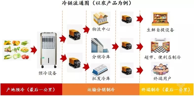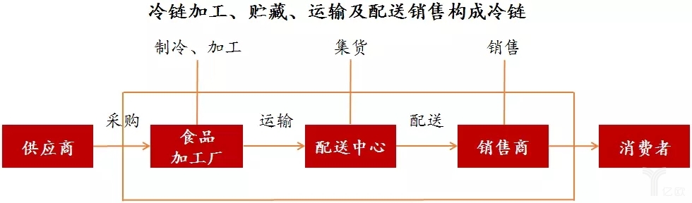 冷链物流涵盖冷冻加工,冷藏贮藏,冷链运输和冷链销售全过程,从制冷设备制造、冷库建设,向后延伸至预冷、运输、储藏、分销、配送、消费展示等环节,涉及冷藏车、冷库、商业冷柜等多种设备,其成本较普通物流要高出40%~60%。