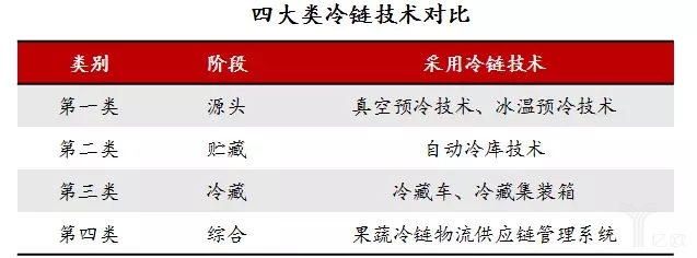 冷链物流又分为四个不同的技术阶段:源头采用真空预冷技术和冰温预冷技术;贮藏阶段采用自动冷库技术;冷藏运输采用冷藏车、铁路冷藏车和冷藏集装箱配套使用的物流模式;运用信息技术建立电子虚拟冷链物流供应链管理系统,对冷链全过程进行动态监控。