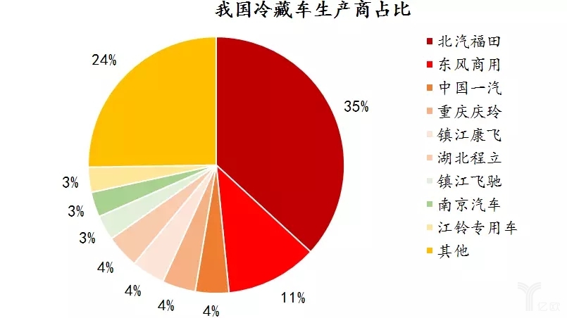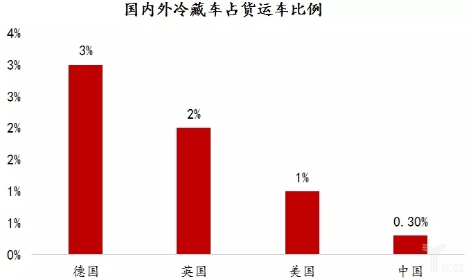 尽管国内冷藏车销量近几年来出现了较快增长,但从冷藏车占货运车的比例来看,和国外相比仍有较大差距。德国占比达到3%,英国2%,美国1%,而中国仅为0.3%。