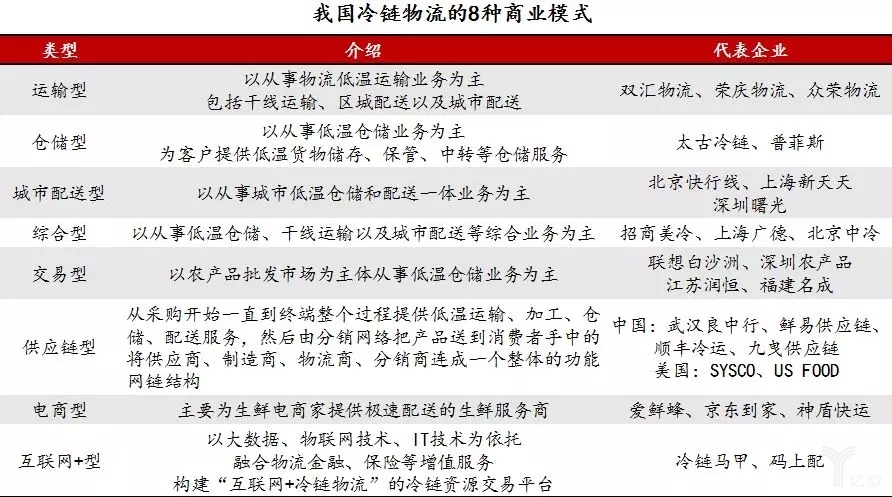 国内冷链服务提供商主要有8种商业模式,分别是运输型、仓储型、城市配送性、综合型、交易型、供应链型、电商型和互联网+型。而目前该市场的竞争者可以分为四大类,分别为由传统物流企业转型、生产商自建自营的冷链部门、专业冷链服务商、国外冷链巨头联手国内企业设立的合资企业。