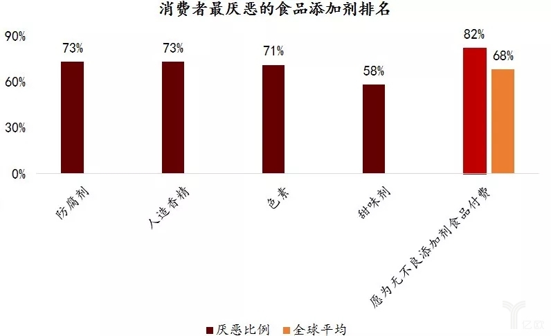 根据尼尔森健康与食品意见调查结果,70%的中国受访者有特定的饮食需求,82%的人愿意为不含不良成分的食物支付更高价格,两项数据均高于全球平均水平。同时,防腐剂为消费者最厌恶的人工食品添加剂。根据《小康》杂志联合清华大学媒介调查实验室的调查结果,食品安全问题连续5年位列“最受关注的十大焦点问题”榜首。