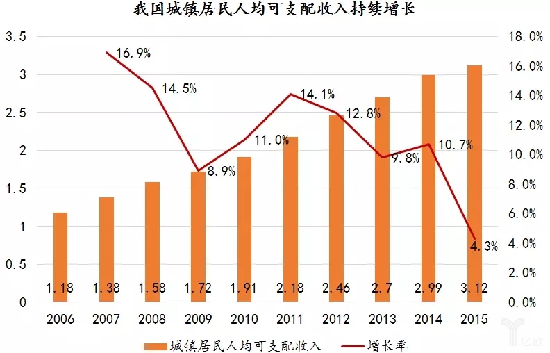 随着我国城镇化道路的不断推进,我国城镇人口持续增加,而在城市地区居民的食品结构中,易腐食品占比较大,储运离不开冷链。2015年我国人均GDP为7485美元,我国城镇人口平均可支配收入近10年保持快速增长,2015年达到3.1万元,同比增长8.2%。依照发达国家经验,人均可支配收入提升到4000美金,冷冻、冷藏食品需求将逐步得到释放,并推动冷冻冷藏食品消费和冷链产业的建设发展。