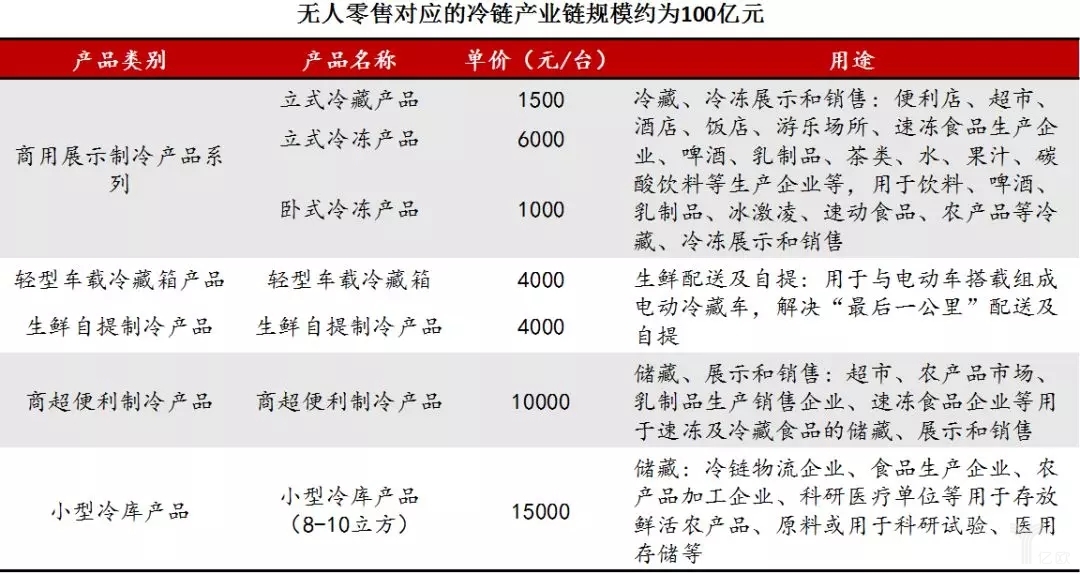 未来,无人零售店将逐步替代传统便利店,同时,由于成本降低和便利性的提升,无人零售店的铺设规模可能远超传统便利店的数量。保守预计未来十年,无人零售店新增20万家,参考占地15平米的缤果盒子10万元造价,无人零售店的投资额将达200亿元。假设每个无人零售店配置5-10台商用冷链产品设施,无人零售店对于商用冷链终端设施的新增需求就可达到100-200万台;如果每台冷链产品设施单价5,000元,则无人零售店对应的冷链产业链规模将达到50-100亿元。