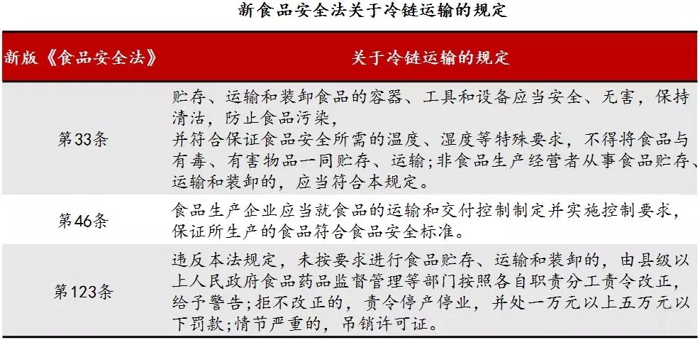 近年来,我国食品安全问题频现,新《食品安全法》倒逼完善冷链体系。食品腐烂变质是造成食品安全隐患的主要原因之一,因此食品在由生产环节最终到达消费者手中的整个产业过程都中,离不开现代冷链物流。冷链物流是对食品安全的最强有力的保证,食品冷链是食品从生产到流通整个过程的特殊供应链系统,在食品运输中应用。