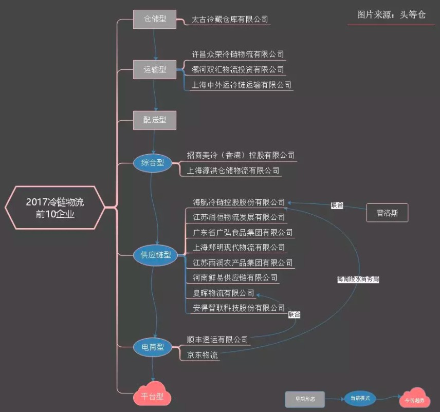 头等仓整理了2017年冷链物流企业排名前15名以及”业余“专业级冷链玩家京东,并对应分类如下: