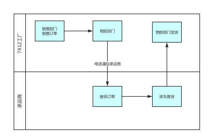 7412工厂与承运商之间的业务主要通过电话通知来提货,流程不规范。下游承运商均未使用物流管理软件,承运商整体的信息化水平较低。项目开展前,7412工厂与承运商之间的业务流程如下图所示: