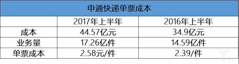 申通在2017年上半年单票快递产品成本则从2.39元上升到2.58元,上升幅度为7.9%。