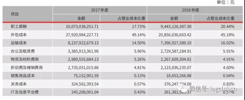 我们再来看看“快递之王”顺丰成本方面的数据: