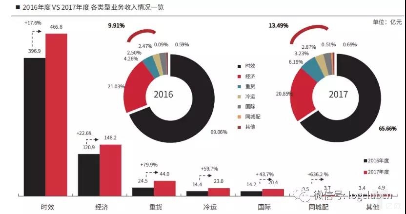 在新业务中,重货运输营收44.02亿元,增长79.93%,占总营收比达6.19%。2017年同城配业务不含税营业收入总计3.66亿元,较上一年同期增长636.18%。冷运与医药业务也保持了高速发展,不含税营业收入达22.95亿,同比增长59.70%。国际业务净收入20.43亿元,较上年增长43.70%。