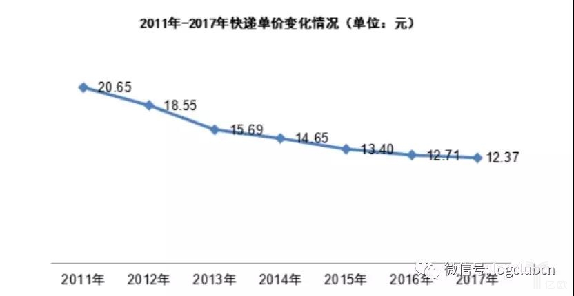 2017年全行业快递均价为12.37元/票,较2016年下降0.34 元/票,降幅2.68%,快递均价连续七年下滑。