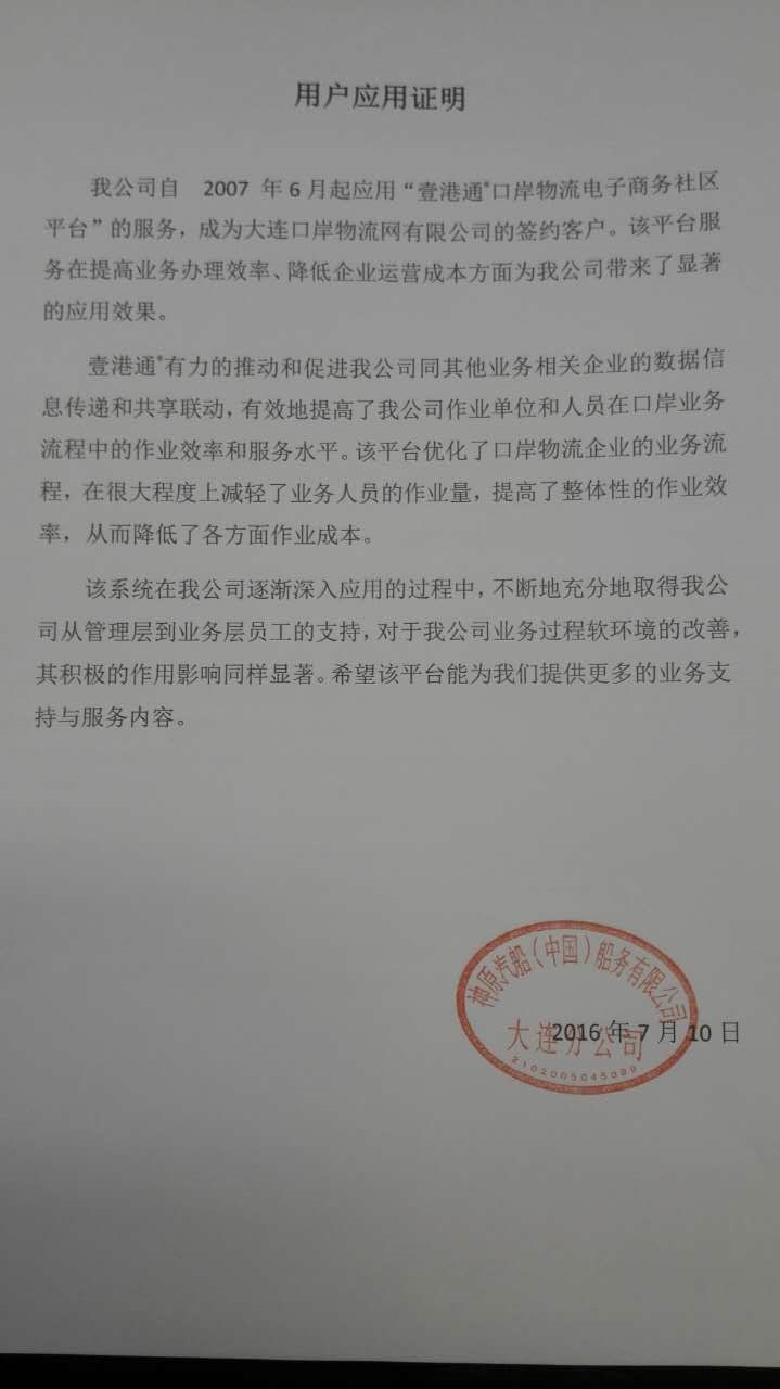 面对以上问题,DPN作为专注港航物流平台建设运营近二十年的专业企业,针对具体问题积极寻求解决办法,先面向信息化程度高、业务环节多、智能化操作要求高的码头客户进行推广突破,继而激发码头业务链上下游物流企业的应用需求。截至目前,壹港通®口岸物流电子商务社区平台累计签约企业级用户700余家,个人注册用户近万名,覆盖大连口岸100%的船代、码头、场站、车队用户,平台服务获得了广大用户单位的好评。