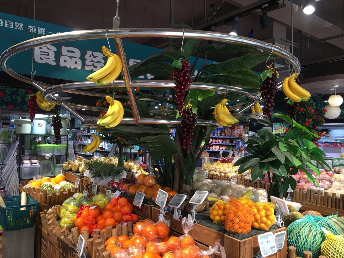 京捷生鲜使用了生鲜的点状设计布局,从入口的水果区向超市内部走,分别经过杂粮、豆制品、半成品、肉、蔬菜、以及主食厨房区。生鲜等高频次购买的食材,均匀以点状布局带面,形成有效分流。其次,出口和入口设计在不同的位置,也利用引流。在陈列上,据安徽眼界介绍,水果陈列道具借鉴于美国全食超市、蔬菜道具设计借鉴于农贸市场;零食架设地借鉴于乐大嘴等品牌,实现京捷生鲜店融合创新。