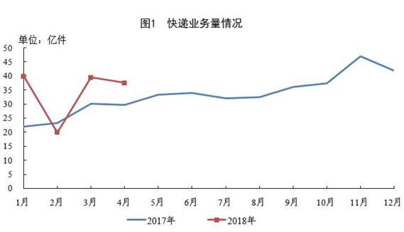 4月,全国快递服务企业业务量完成37.5亿件,同比增长25.8%;业务收入完成467.2亿元,同比增长26.5%。