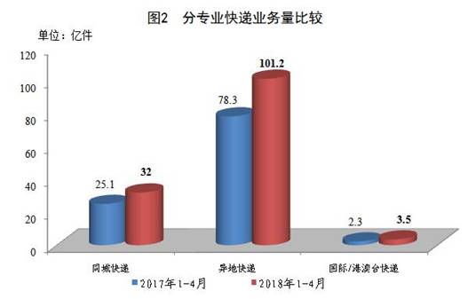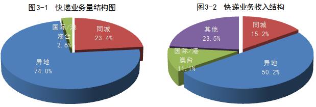 1-4月,同城、异地、国际/港澳台快递业务量分别占全部快递业务量的23.4%、74%和2.6%;业务收入分别占全部快递收入的15.2%、50.2%和11.1%。与去年同期相比,同城快递业务量的比重下降0.4个百分点,异地快递业务量的比重基本持平,国际/港澳台业务量的比重上升0.4个百分点。