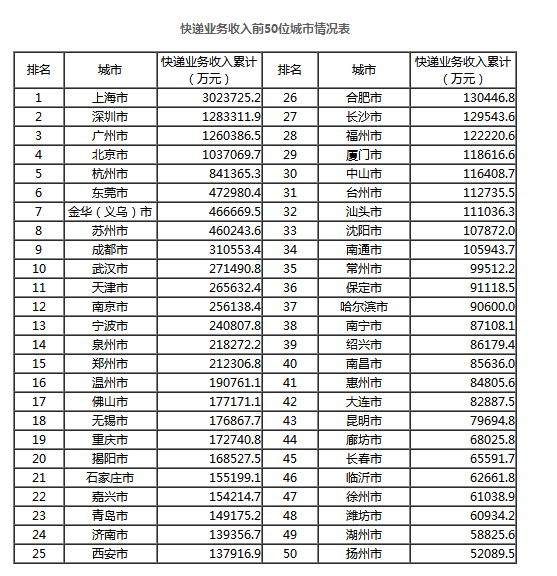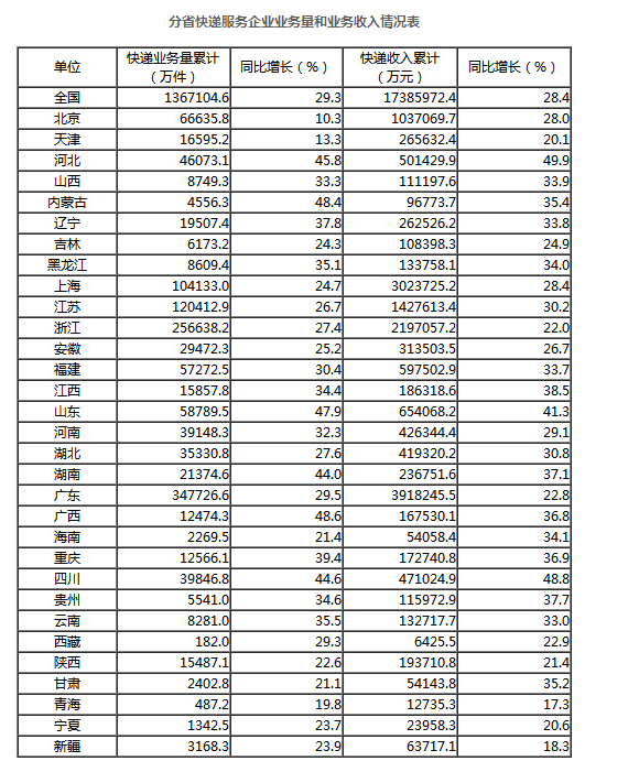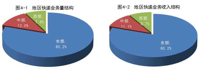 1-4月,东、中、西部地区快递业务量比重分别为80.2%、12%和7.8%,业务收入比重分别为80.2%、11.1%和8.7%。与去年同期相比,东部地区快递业务量比重下降了0.6个百分点,快递业务收入比重下降了0.7个百分点;中部地区快递业务量比重上升了0.1个百分点,快递业务收入比重上升了0.2个百分点;西部地区快递业务量比重上升了0.5个百分点,快递业务收入比重上升了0.5个百分点。