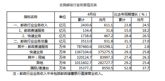 4月份,全行业业务收入完成611.1亿元,同比增长24.5%;业务总量完成931.8亿元,同比增长27%。