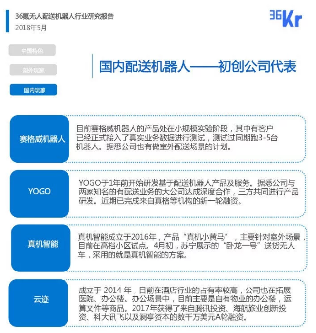 2017年底深兰、云迹、Segway Robotics等初创公司相继展示了无人售货机器人Demo,其实质也是室内配送机器人的一种。近期业内传闻称,YOGO获得了新一轮融资,其中包括了真格历史上最大的一笔投资,做的也是室内配送的方向。真机智能的室外配送机器人也已在高档物业试点。