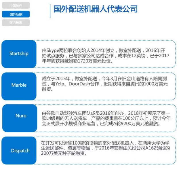 另外,除了菜鸟、京东、美团外卖、四通一达等创业公司,这一领域还有一些其他的潜在合作伙伴值得关注。以室内配送为例,诸如百米站等有物业资源的公司也有可能成为潜在的合作伙伴。