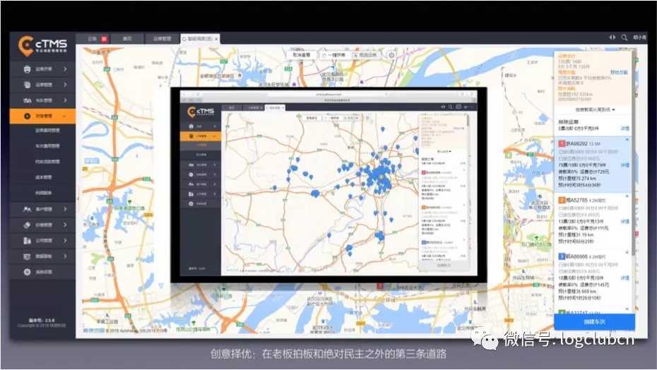 这个是大家很熟悉的“cTMS智能调度”界面。我们只要点一下,就能把需要配送的成千上万个地址随机的订单,自动地匹配给合适的车辆,求出装载率、配送线路上的最优解,实现“十秒千单”的调度结果。
