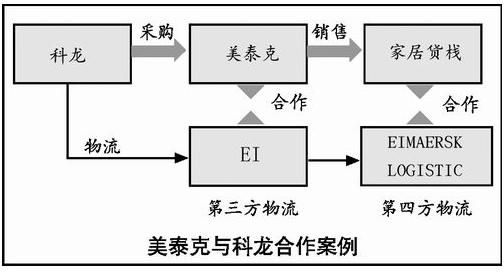 以美泰克与科龙的合作为例,美泰克在科龙采购冰箱销售到北美的连锁店家居货栈,EI是美泰克的全球物流合作伙伴,MAERSK LOGISTIC 是家居货栈的物流合作伙伴,远东至北美的门到门服务均是由第三方物流EI和第四方物流MAERSK LOGISTIC 完成。