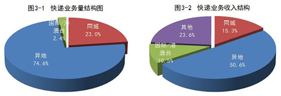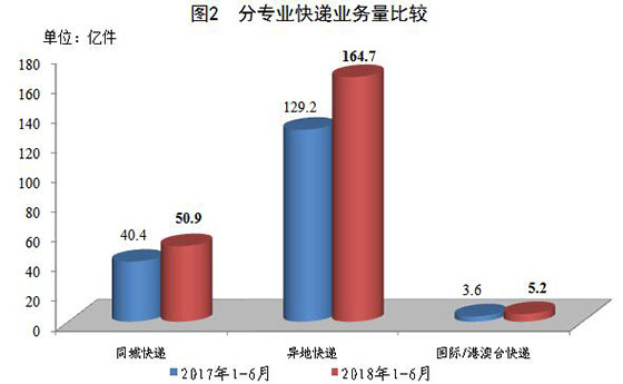 上半年,同城、异地、国际/港澳台快递业务量分别占全部快递业务量的23%、74.6%和2.4%;业务收入分别占全部快递收入的15.3%、50.6%和10.5%。与去年同期相比,同城快递业务量的比重下降0.3个百分点,异地快递业务量的比重基本持平,国际/港澳台业务量的比重上升0.3个百分点。