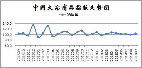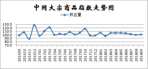 2018年9月份,大宗商品供应指数为101.1%,较上月回升1.0个百分点,时隔三个月后再现上升趋势,显示随着生产利润回升,商品产量增加,市场供应所有增长。各主要商品中,本月钢铁和化工供应量明显增加,成品油供应增速有所放缓,其余品种则仍有不同程度的减少。从本月数据情况来看,综合指数回升主要受钢铁和化工等商品供应回升拉动的影响,其余品种随企业利润也有恢复,但仍维持较低水平,产量供给低于预期值。