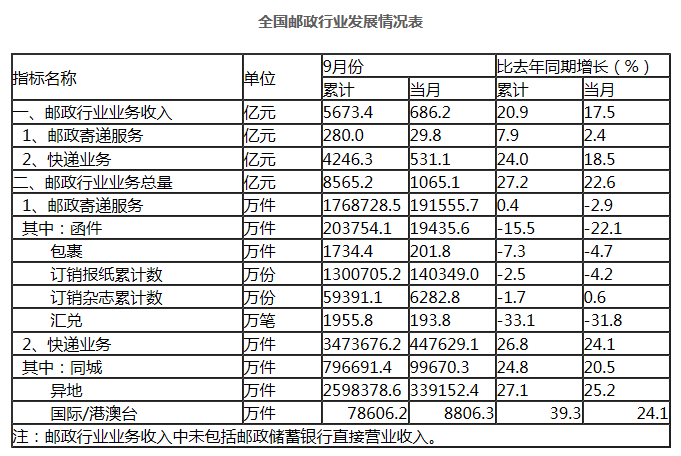 1-9月,邮政行业业务收入(不包括邮政储蓄银行直接营业收入)累计完成5673.4亿元,同比增长20.9%;业务总量累计完成8565.2亿元,同比增长27.2%。