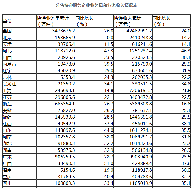 9月份,全国快递服务企业业务量完成44.8亿件,同比增长24.1%;业务收入完成531.1亿元,同比增长18.5%。