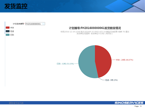 需实现项目发货信息登记及对相关人员的推送,设置发货审批程序;实现运输计划推送,及承运公司运输车辆安排信息登记;设置储罐封条开启程序;实现运输车辆装车信息登记;实现上批次已发出但未到达货物与新发货计划的对接,避免重复发货;