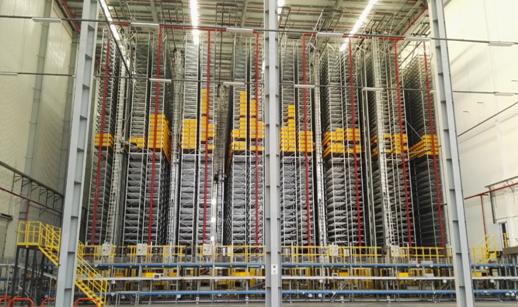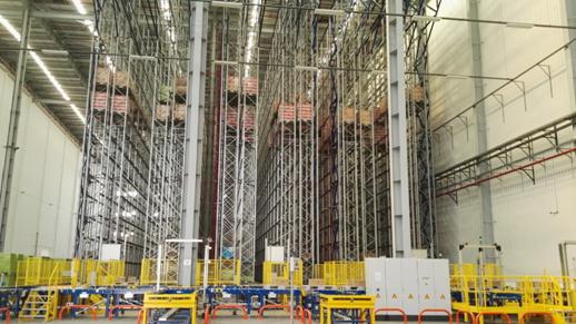 南京二期自动托盘堆垛系统包含3个巷道共 10608个存储位, 3台高速自动托盘堆垛机,含双深位载货台,高度为22米双深位存储位,技术能力可达到双循环90个托盘/小时(单循环可达到150托盘/小时左右)。传统仓库主要利用横梁托盘货架配合高位叉车,效率低下,ASRS托盘堆垛系统中每一台堆垛机的效率是传统仓库高位叉车的4-5倍,而且不需要人员操作,准确率高,人员成本接近为零。