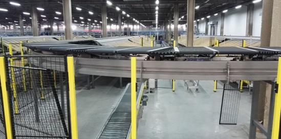 可理解为快递点分拣,用于快递揽件来的包裹以及二楼顾客包装工作站做好顾客包裹的小件拆零产品(特指运输料箱装载率不高的)的分拣。通过12个人工供件台,将包裹投放到分拣机上,分拣机自动扫描包裹上条码识别目的地,并自动在相应目的地道口弹出,进行运输料箱装箱操作后,通过输送线送到下一个区域进行下一步操作。