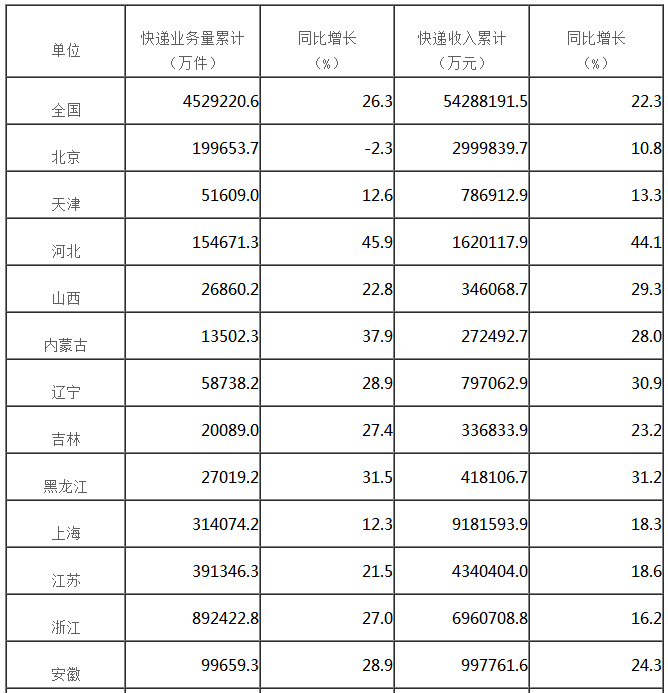 分省快递服务企业业务量和业务收入情况表