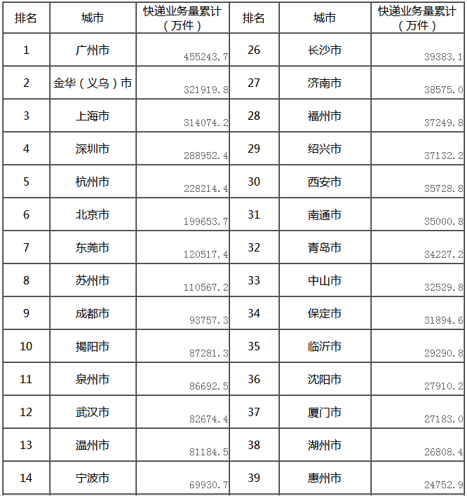 快递业务量前50位城市情况表