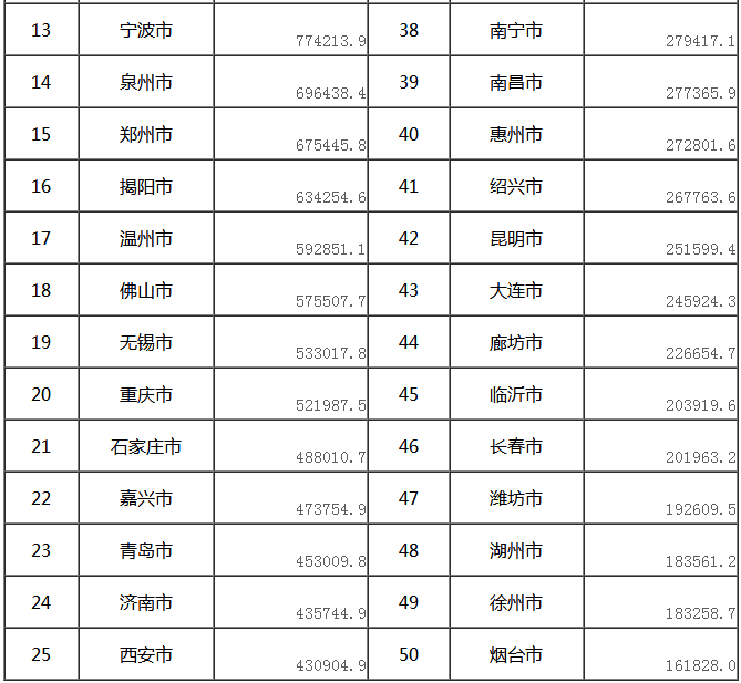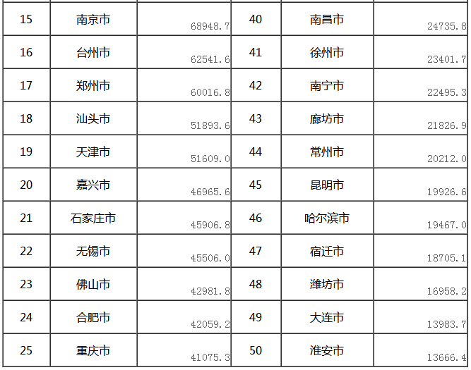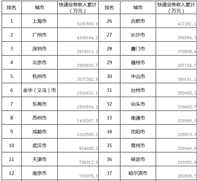 快递业务收入前50位城市情况表