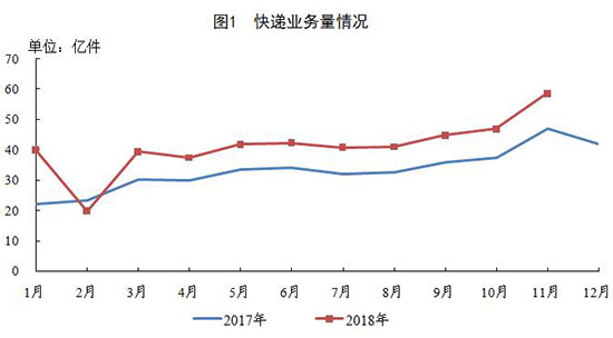 11月,全国快递服务企业业务量完成58.6亿件,同比增长24.4%;业务收入完成648.3亿元,同比增长14.6%。