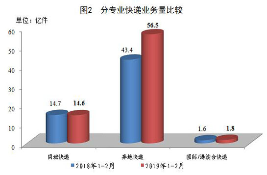 1-2月,同城、异地、国际/港澳台快递业务量分别占全部快递业务量的20%、77.5%和2.5%;业务收入分别占全部快递收入的11.1%、51.5%和10.5%。与去年同期相比,同城快递业务量的比重下降4.6个百分点,异地快递业务量的比重上升4.8个百分点,国际/港澳台业务量的比重下降0.2个百分点。