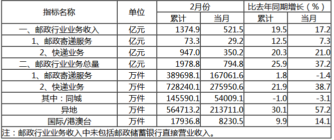 2月份,全行业业务收入完成521.5亿元,同比增长17.2%;业务总量完成794.8亿元,同比增长37.2%。