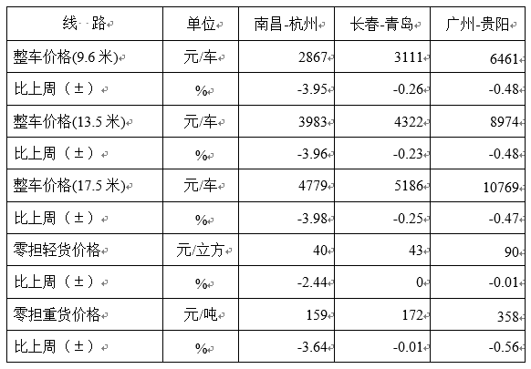 表1 本周部分线路平均价格及环比情况对比