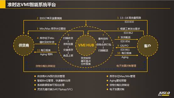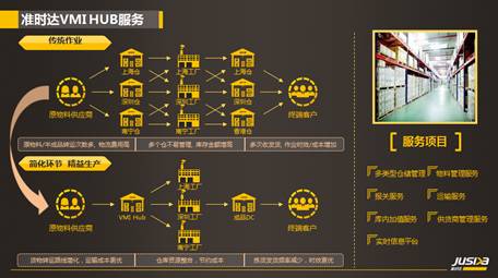 准时达供应链协同仓(VMI HUB),适用于供应商数量多,供货频次高,且生产规模大的制造商,如C客户的制造商。各地供应商按照生产预测将物料提前运送至准时达VMI HUB,由供应商自己管理库存,当制造商需要生产用料时,VMI HUB会依照生产要求把零配件按成品需求比例配置好,进行JIT产前集拼出货。上线前进行物权交割,实现真正意义上的JIT供料模式。