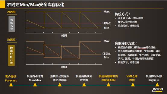 传统的Min/Max库存水位数据是人工计算,一成不变的,准确性差,效果也不好。在准时达的供应链协同仓,我们依靠工业大数据的应用,提前13周采集客户的forecast,并定期结合每周消耗量与频率、交货周期、最大出货量、市场需求、生产计划、运输资源、天气、路况、节日影响等采集数据,动态优化。