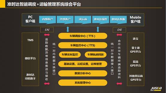 准时达的智能调度+运输管理系统平台,开放式地引入了市场上先进的供应链规划和系统工具,并对其进行充分的数据集成。通过PC和Mobile客户端,为客户提供便捷的可视化查询工具。