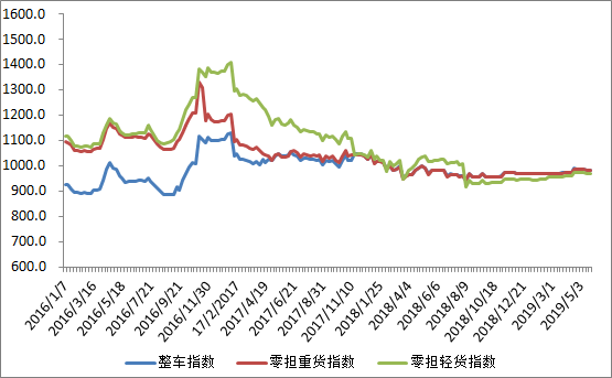 分车型看,各车型指数涨跌互现。其中,整车指数为983.16点,环比回升0.06%;零担重货指数为982.76点,环比回落0.02%;零担轻货指数为968.45点,环比回落0.04%。