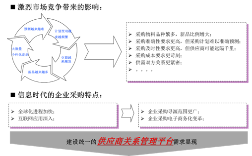 随着全球经济的一体化,激烈的企业市场竞争,要求在优化企业内部资源的基础上,如何整合外部的供应商资源,以应对环境和竞争对手的挑战成为企业需要首先考虑的重要问题。五粮液希望通过管理变革及信息工具的使用,建立内部的需求、采购、监督等部门之间、供需双方之间的信息共享和交互的系统显得尤为重要和迫切。
