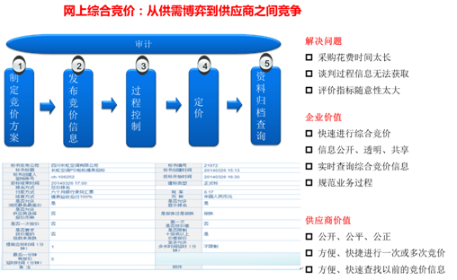 其中,监督管理部门可以在投标前参与招标相关文件的审核或会签,在报价过程查看实时信息,也可以在过程结束后通过查看系统过程记录对其业务合规性进行审查,达到事前预防、事中控制、事后审计的目的。