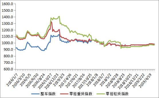 分车型看,各车型指数有不同程度回落,零担轻货指数回落是整体回落的主要因素。其中,整车指数为983.12点,与上周基本持平;零担重货指数为982.46点,环比回落0.03%;零担轻货指数为967.37点,环比回落0.11%。